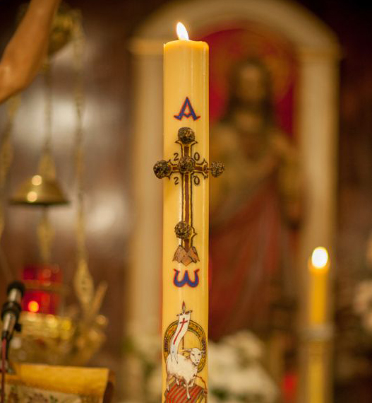 Es un cirio grande y decorado con una cruz en el centro que se usa durante la Vigilia Pascual. Su luz simboliza la resurrección de Cristo.